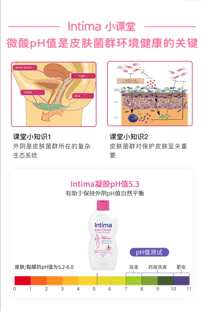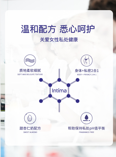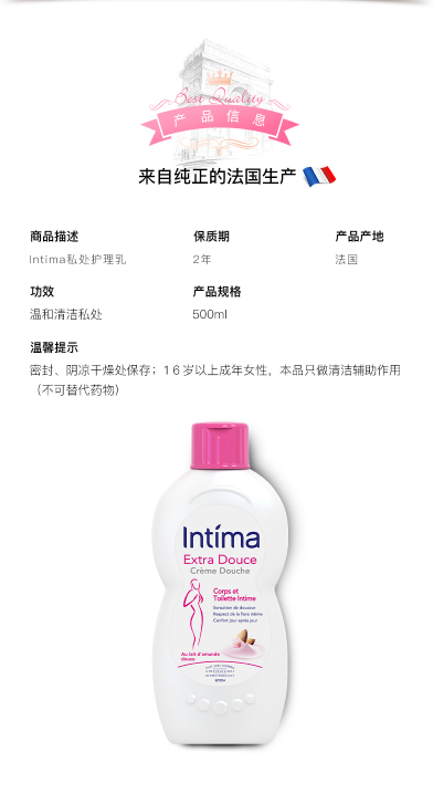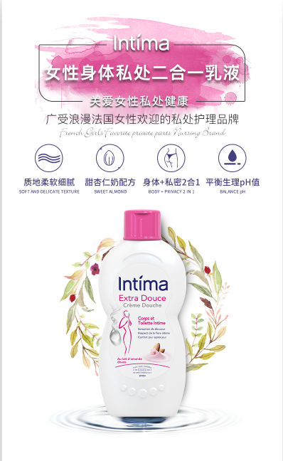 法国专业的女性清洁品牌Intima身体+私密2合1乳液,该品牌创建于在1990年,已经专注女性私处护理30年。所有配方都是经过皮肤病学和妇科检测的,品质可以放心,法国妇科医生推荐产品,广受法国女性欢迎。Intima不同于普通肥皂及沐浴露,使用无皂配方、温和杀菌,保持私处PH值酸碱平衡,能有效抑制细菌生长,在亲密前后、生理期、日常护理都可以使用,呵护私处健康。