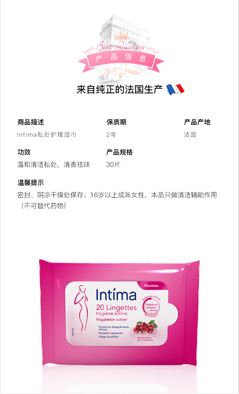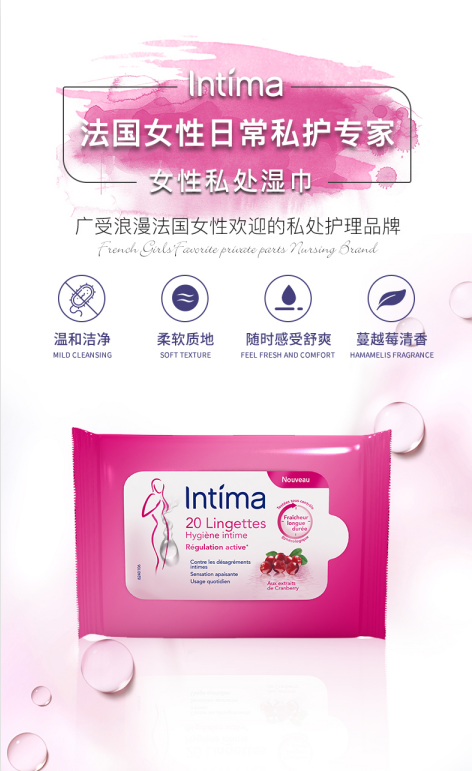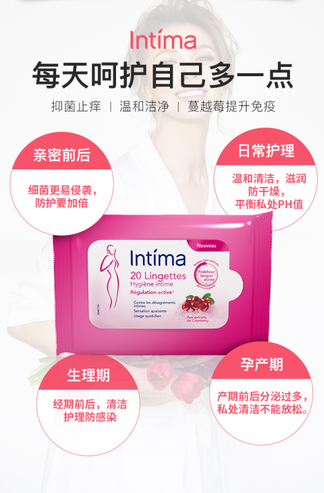Intima 私处清洁湿纸巾 蔓越莓香型 清洁抑菌 止痒去异味 温和不刺激 平衡私处PH。温馨提示:密封、阴凉干燥处保存,适合16岁以上成年女性,本品只做清洁辅助作用(不可替代药物)